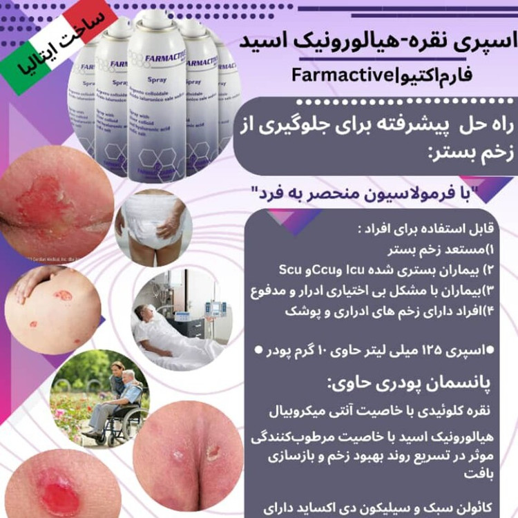 موارد مصرف اسپری نقره فارم اکتیو زخ بستر بریدگی ها آسیب عروقی خراشیدگی ها زخم پـای دیابتیک عوارض پس از عمل سوختگی های موضعی کوچک ادرار سوختگی و ضایعات مربوط به بی اختیاری مدفوع