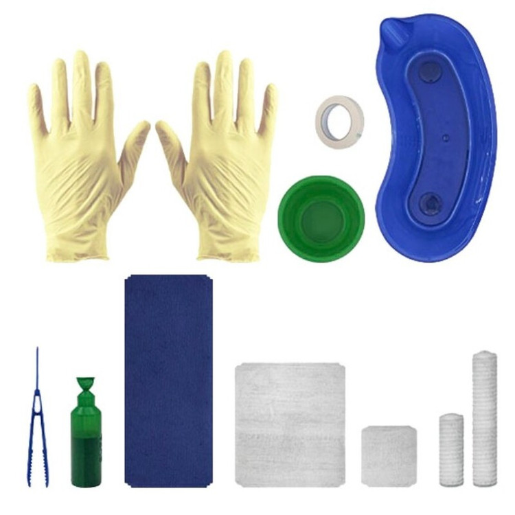 یک جفت دستکش یکبار مصرف لاتکس ، باند کناربافت ۱۰ سانتیمتر ، باند کناربافت ۵ سانتیمتر ، گاز کوچک ۸ لا، گاز بزرگ ۸ لا، پنست یکبار مصرف، شان ۴۰ سانتیمتر در ۵۰ سانتیمتر، چسب ضد حساسیت ۲۵/۱ سانتیمتر در ۱۴۰ سانتیمتر، گالی پات (Gallipot) و رسیور (Reciever)، بتادین (حدود ۲۰ سیسی)